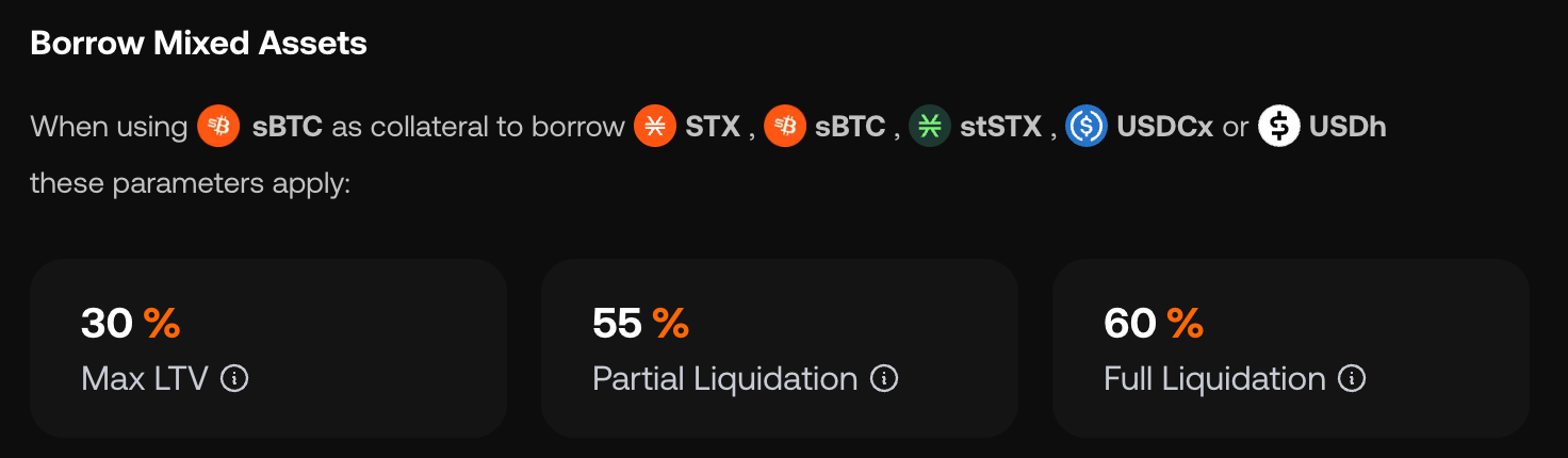 For instance, if sBTC had a 70% LTV, that 70% applied whether the user borrowed USDC, USDh, STX, stSTX, or anything else..