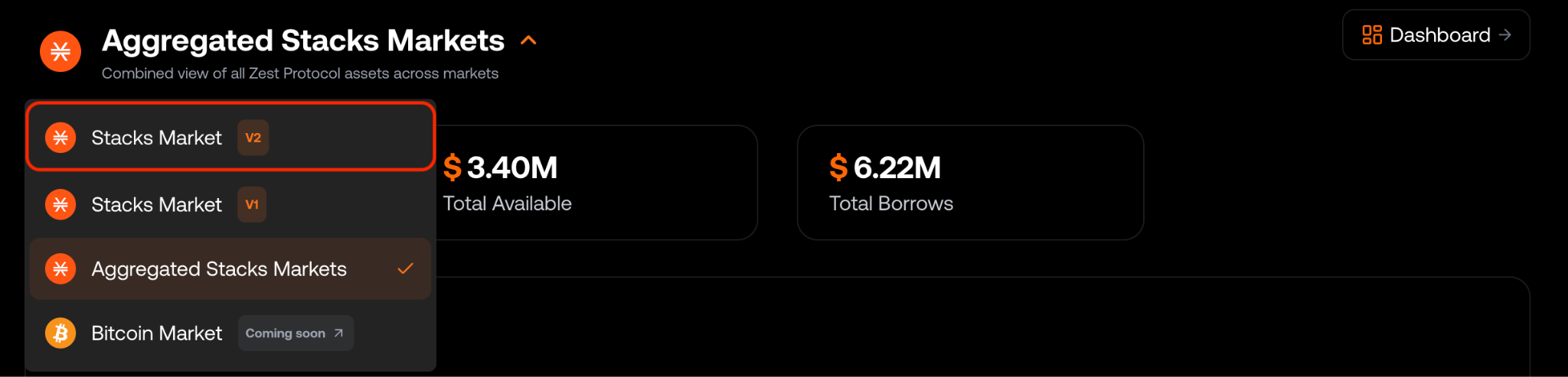 You can also migrate manually by closing any borrowing positions on v1, withdrawing your liquidity, and then depositing it into v2. Switching between v1 and v2 is simple: use the market selector in the top-left corner of the interface, as shown below.