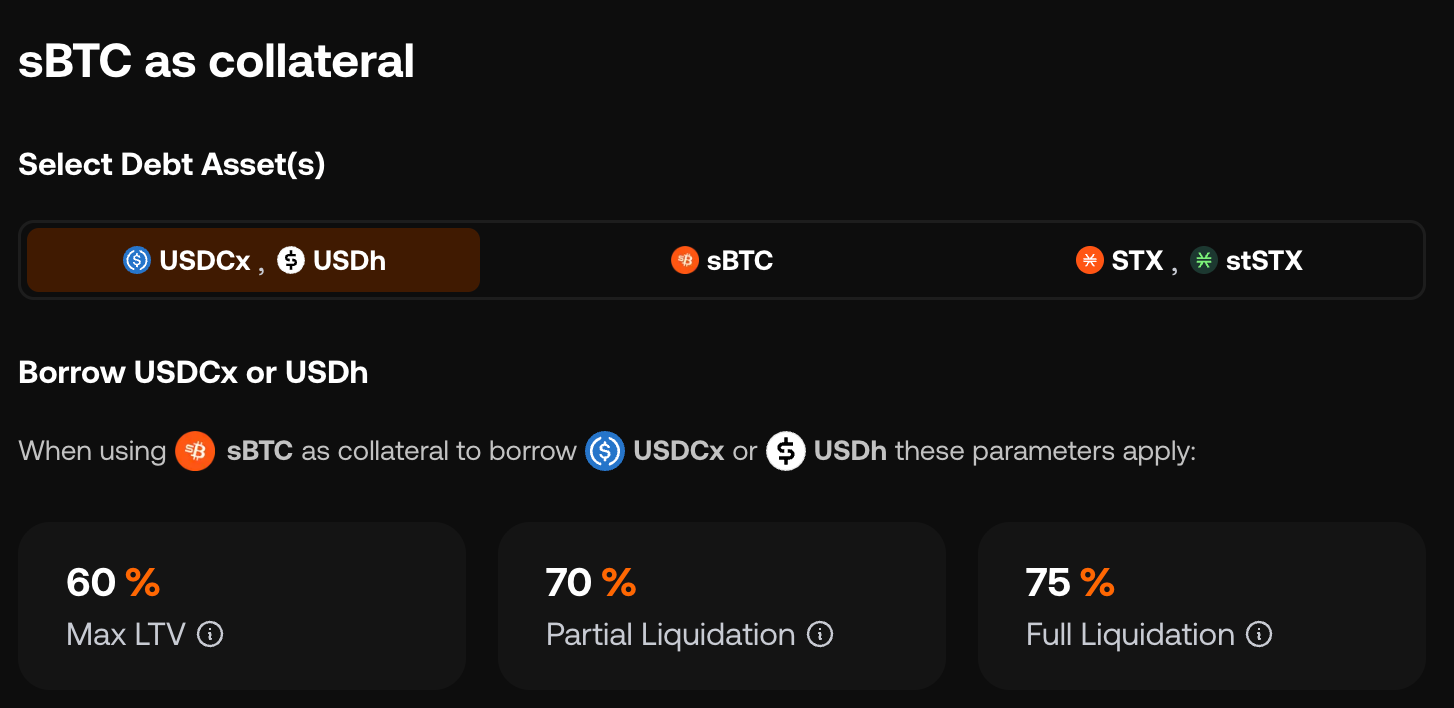 For example, with sBTC as collateral and USDC as the borrowed asset, partial liquidations begin at a 85% LTV, while full liquidation occurs at 95%.